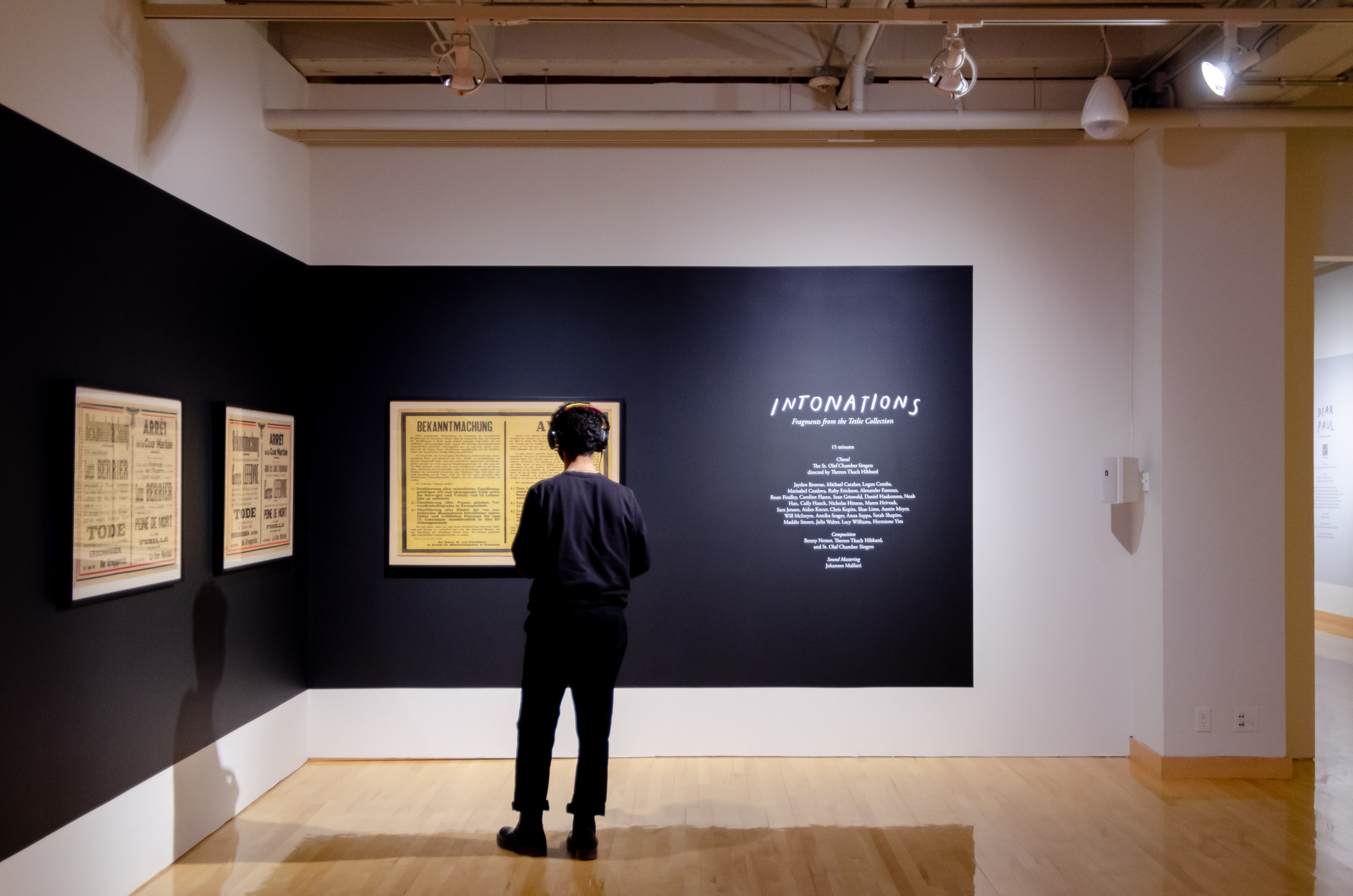 The resulting artwork includes a suite of audio guides that take epistolary form, scripted as letters from Nemer to curator Jane Becker Nelson, paper conservator Dianna Clise, and poet and Holocaust survivor Paul Celan. The three “audio letters”— narrated by Nemer and St Olaf community members Shae Lime and Timothy Rainey II — ask a number of critical questions about the history of the posters, the ethics of their restoration, and their legacy for the future. Nemer worked with the St Olaf Chamber Singers under the direction of Therees Tkach Hibbard to voice texts that appeared on these posters in French, German, and Dutch. Pandemic measures required that rehearsals and recordings take place remotely, with singers wearing masks and social distancing.