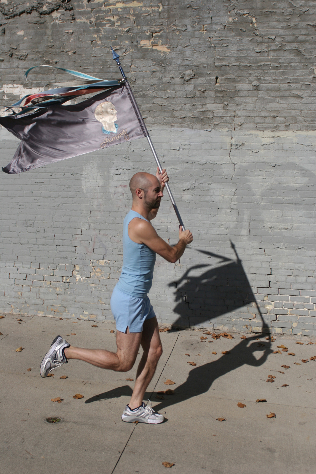 The first gesture involved the design of a heraldic flag featuring an embroidered image of Somerville produced in collaboration with artist Heather Goodchild, with ribbons stitched with the lyrics from Smalltown Boy. For the exhibition Rockstars and Wannabes at Urban Primitive, the flag was activated through a jogging performance in which Nemer ran through the streets of downtown Winnipeg, tracing the refrain of the song—run away, turn away, run away, turn away—letter by letter into the pavement.